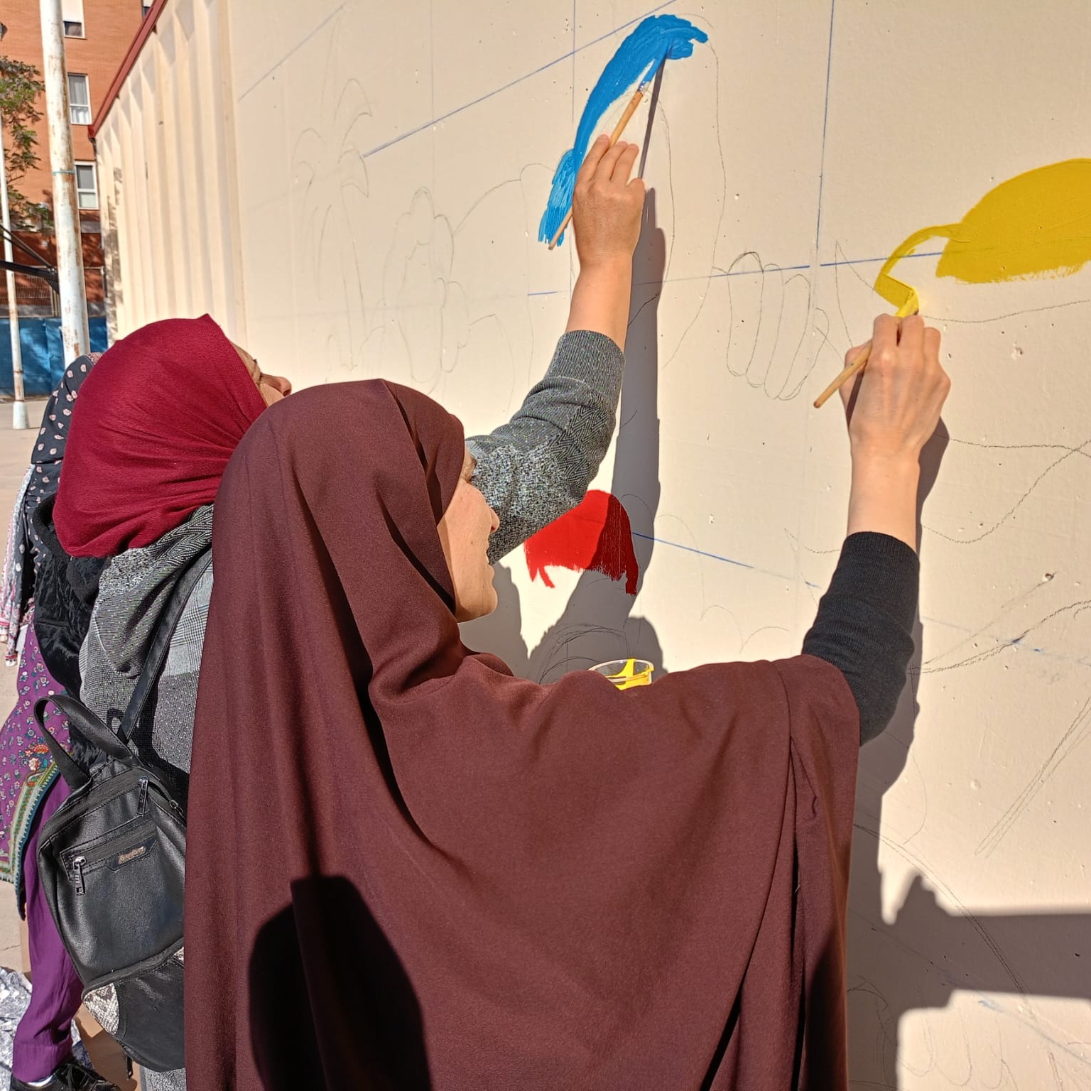 El 6 de mayo las madres de la «Escuela de castellano Aprendamos juntas» del CEIP Miguel Hernández en Orriols han finalizado el mural en el patio de recreo del Colegio, como parte de la praxis del aprendizaje y ejercicio del castellano. Iniciativa que por tercer curso consecutivo celebra la interseccionalidad y la igualdad de oportunidades. Gracias a todas las alumnas, a nuestra artista Pilar del Río y a las profesoras Vanessa Gómez, Carla Pérez de Tudela, Marta Peñalver y Marta Vela.